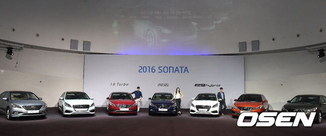 ‘2016년형 쏘나타’ 사진발표회에서 차와 함께 모델들이 포즈를 취하고 있다. /지형준 기자 jpnews@osen.co.kr