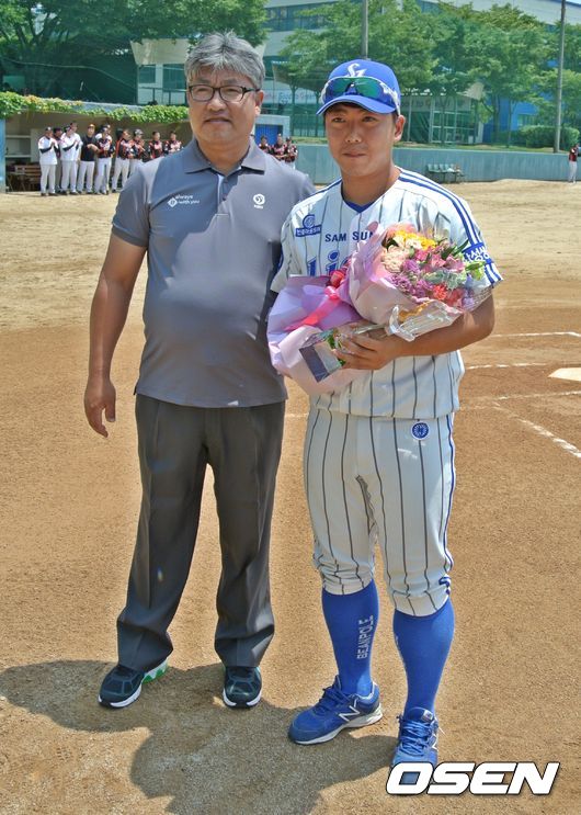문선엽은 2일 경산 볼파크에서 열리는 롯데 자이언츠와의 퓨처스 경기를 앞두고 퓨처스리그 사이클링 히트 달성에 대한 수상을 했다. 오석환 KBO 퓨처스 심판 육성위원이 기념 트로피를 전달했다.