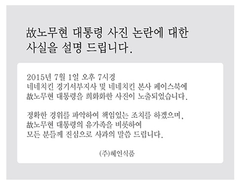네네치킨은 페이스북 담당 직원이 '비하 의도는 없었고, 서민 대통령과 서민 치킨이 잘 어울릴 것 같아 인터넷에 떠도는 사진을 이용해 제작했다'고 해명했다고 전했다.