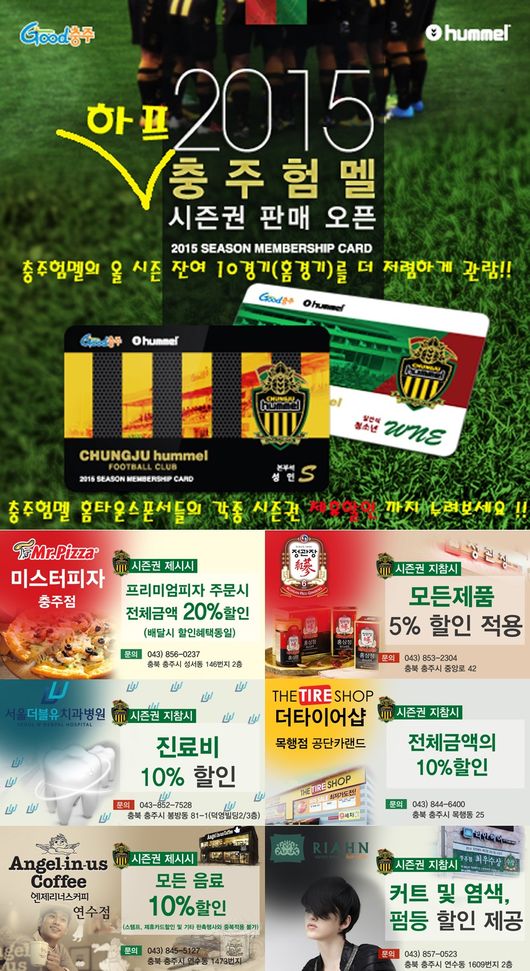 또한 기존의 시즌권 구매자를 포함해 하프시즌권 구매자에게는 구단의 홈타운 스폰서들과의 제휴를 통해 음식점, 카페, 치과, 헤어샵, 건강식품, 자동차 타이어 전문점 등 일상생활에서 소비하는 부분에 대해 시즌권 제휴할인이 대폭 적용되어 시즌권 구매자들에게 실용성을 제공 할 예정이다. 충주험멜은 홈타운 스폰서를 지속적으로 확대해 시즌권 구매자들에게 다양한 제휴혜택을 제공할 계획이다.