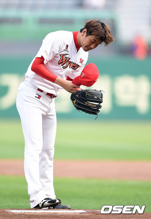 2일 오후 인천 SK 행복드림구장에서 열린 '2015 타이어뱅크 KBO 리그' SK 와이번스와 kt 위즈의 경기, 경기시작전 SK 선발 투수 김광현이 팬들을 향해 인사하고 있다.