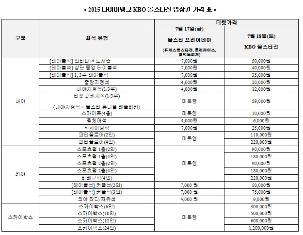 2015 타이어뱅크 KBO올스타전 입장권예매가 오는 7일 오후 2시부터 인터파크(ticket.interpark.com)와 ARS(1544-1555), 스마트폰 인터파크 티켓 어플리케이션을 통해 단계적으로 시작된다.