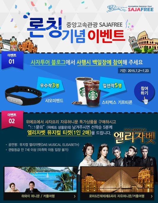 이에 7월 한 달 동안 사자투어닷컴(www.sajatour.com)에서 '사자프리 퍼즐을 완성하라!'' 이벤트를 진행해 참여자를 대상으로 엘리자벳 뮤지컬 티켓(R석), 샤오미 밴드, 스타벅스 아메리카노 등 총 50명에게 경품을 제공한다.