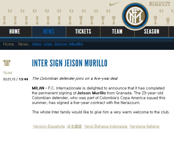 인테르는 지난 3일(한국시간) 저녁 구단 공식 홈페이지를 통해 무리요와 5년 계약을 체결했다고 발표했다.