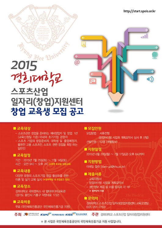경희대학교 스포츠산업 일자리(창업)지원센터에서는 스포츠 시장의 수요변화에 대응하는 새로운 스포츠 시장 창출을 주도할 스포츠기업 창업 및 육성지원 정책을 통해 우수한 예비창업자를 대상으로 창업실무교육 및 멘토링을 제공하여 성공 창업을 지원하고자 아래와 같이 교육생을 모집하오니 많은 관심과 참여 바랍니다.
