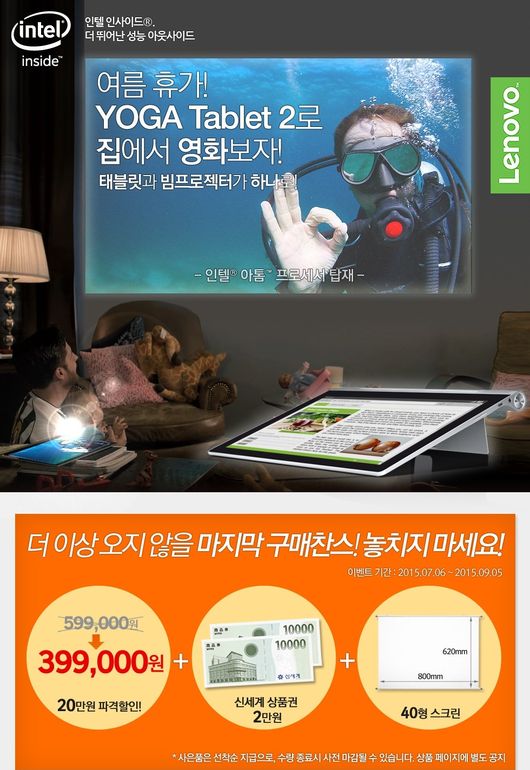 이번 프로모션은 11번가를 비롯해 옥션과 지마켓에서 동시 진행되며, 오픈마켓 별로 푸짐한 사은품을 제공한다. 특히 주력 제품인 요가 태블릿 2 프로를 구매하는 고객에게는 전 마켓 공통으로 20만원 할인 혜택이 주어진다. 또한 휴가 시즌을 맞이해 집이나 캠핑장 등에서 이동식 극장과 같은 분위기를 연출할 수 있도록 40형 대형 스크린을 선착순 사은품으로 제공한다.