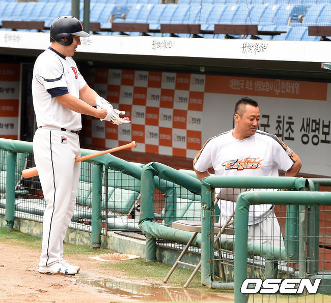 두산 김현수가 훈련을 하며 한화 조인성과 이야기를 나누고 있다./jpnews@osen.co.kr