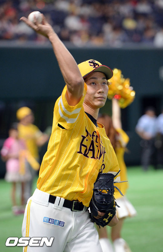 7일 오후 일본 후쿠오카 야후오크돔에서 소프트뱅크 호크스와 라쿠텐 골든이글스의 경기, 경기시작전 소프트뱅크 선발 투수 다케다가 몸을 풀고 있다.
