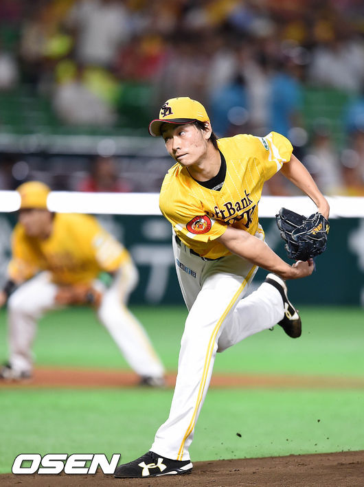 7일 오후 일본 후쿠오카 야후오크돔에서 소프트뱅크 호크스와 라쿠텐 골든이글스의 경기, 1회초 소프트뱅크 선발 투수 다케다가 힘차게 공을 던지고 있다.