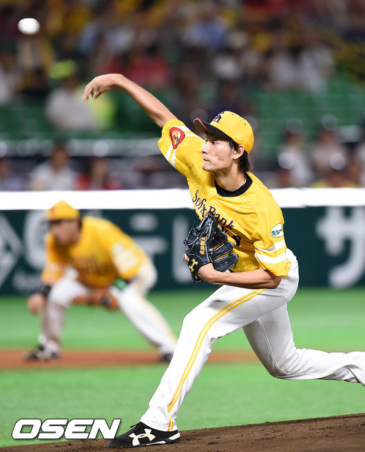 7일 오후 일본 후쿠오카 야후오크돔에서 소프트뱅크 호크스와 라쿠텐 골든이글스의 경기, 1회초 소프트뱅크 선발 투수 다케다가 힘차게 공을 던지고 있다.