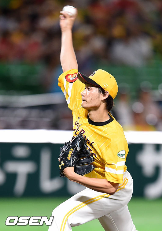 7일 오후 일본 후쿠오카 야후오크돔에서 소프트뱅크 호크스와 라쿠텐 골든이글스의 경기, 1회초 소프트뱅크 선발 투수 다케다가 힘차게 공을 던지고 있다.