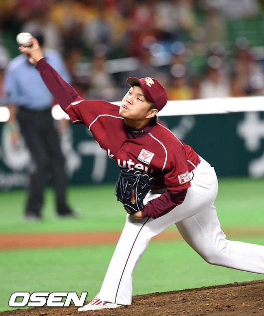7일 오후 일본 후쿠오카 야후오크돔에서 소프트뱅크 호크스와 라쿠텐 골든이글스의 경기, 1회말 라쿠텐 선발 투수 노리모토가 힘차게 공을 던지고 있다.