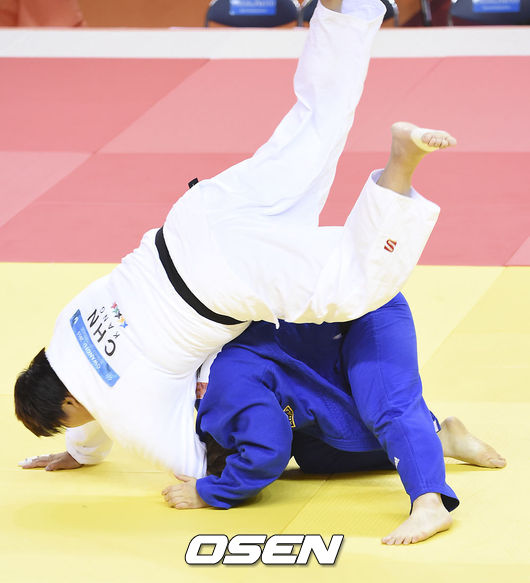 7일 오후 광주 염주빛고을체육관서 열린 '2015 광주하계유니버시아드대회' 유도 여자 무제한급 결승전에서 김지윤이 엎어치기로 절반을 얻어내고 있다