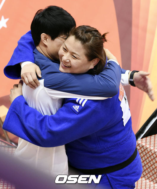 7일 오후 광주 염주빛고을체육관서 열린 '2015 광주하계유니버시아드대회' 유도 여자 무제한급 결승전에서 김지윤이 금메달을 딴 뒤 감독과 포옹을 하고 있다.