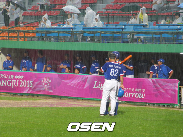 7일 광주 무등야구장에서 벌어진 2015 광주 유니버시아드 야구 한국과 프랑스 경기가 도중 내린 비로 순연됐다. 한국은 0-0이던 5회초 무사 1,3루 절호의 기회를 잡았으나 경기가 중단됐고 야속하게도 비가 그치지 않아 노게임이 선언했다.