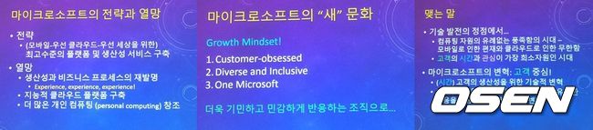이어 김 박사는 "경쟁 제품에 밀려나는 것은 순식간이었다. 먼저 투자하고 혁신을 선보했지만 기술만 중시하다보니 고객들의 마음을 제대로 이해하지 못했고 호응을 이끌어내지 못했다"면서 "새 시대, 새 마이크로소프트는 클라우드 등의 기술적 변혁과 함께 (업무에 필요한) 사람들의 시간과 (기술에 대한) 사람들의 관심에 대한 문화적 변혁을 함께 해야 했다"고 반성에 나섰다.