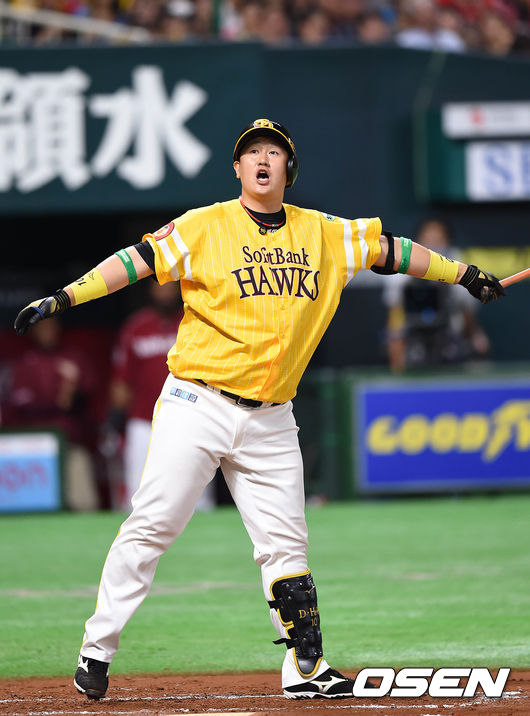 7일 오후 일본 후쿠오카 야후오크돔에서 소프트뱅크 호크스와 라쿠텐 골든이글스의 경기, 8회말 2사 소프트뱅크 이대호가 파울을 친 후 아쉬워하고 있다.