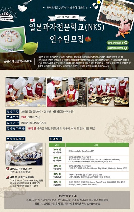 먼저 브레드가든의 연수단으로 선발될 경우 55년 전통의 일본 과자전문학교(NSK)와 브레드가든이 특별히 마련한 단기 연수 프로그램에 참여할 수 있는 기회가 주어진다. 1960년에 설립된 일본 과자전문학교는 일본에서 유일하게 제과업계와 일본양과자협회가 설립한 전문학교로 체계적이고 전문적인 제과제빵 교육을 실천하고 있으며, 국내 유명 제과점의 파티시에들을 다수 배출해낸 곳이기도 하다.