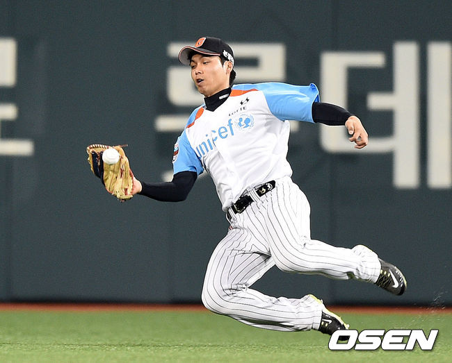 1대 1 팽팽한 동점상황이 이어지고 있던 4회초, 김문호는 NC 선두타자 테임즈의 라인드라이브성 타구를 정확한 타이밍으로 잡아냈다. 올해로 10년 차를 맞은 김문호는 올 시즌 좋은 수비를 선보이며 최고의 시즌을 보내고 있다.