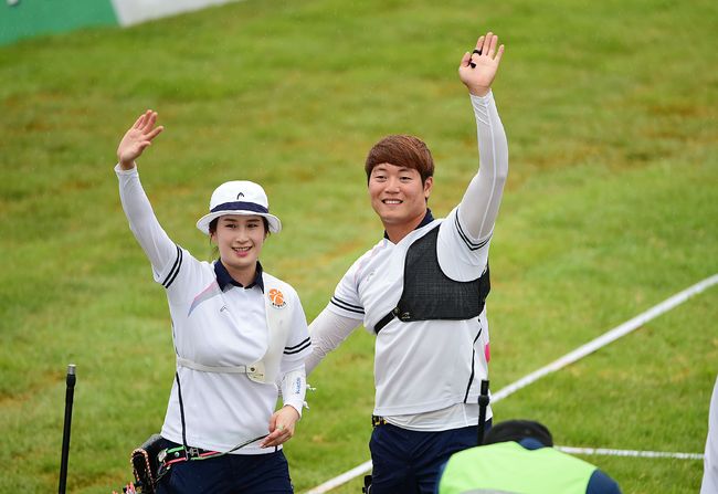 기보배와 이승윤은 8일 오후 광주국제양궁장에서 열린 양궁 리커브 혼성전에서 대만의 웨이춘헝, 탄야팅 조를 타이브레이크까지 가는 접전 끝에 5-4로 물리치고 금메달을 획득했다. 오전에 열린 남자단체전에서 금메달을 땄던 이승윤은 대회 2관왕에 올랐다. 기보배는 단체전 은메달에 이어 금메달을 추가했다.