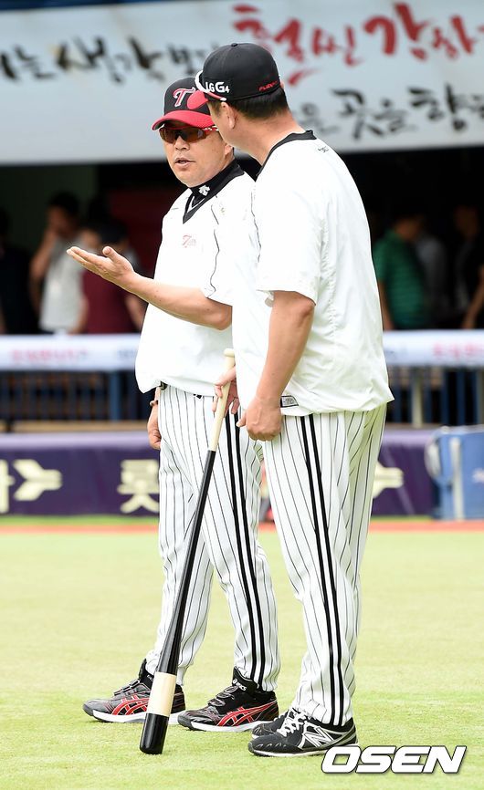 8일 오후 서울 잠실야구장에서 열리는 '2015 타이어뱅크 KBO 리그' LG 트윈스와 롯데 자이언츠의 경기를 앞두고, LG 양상문 감독과 차명석 코치가 대화를 나누고 있다.