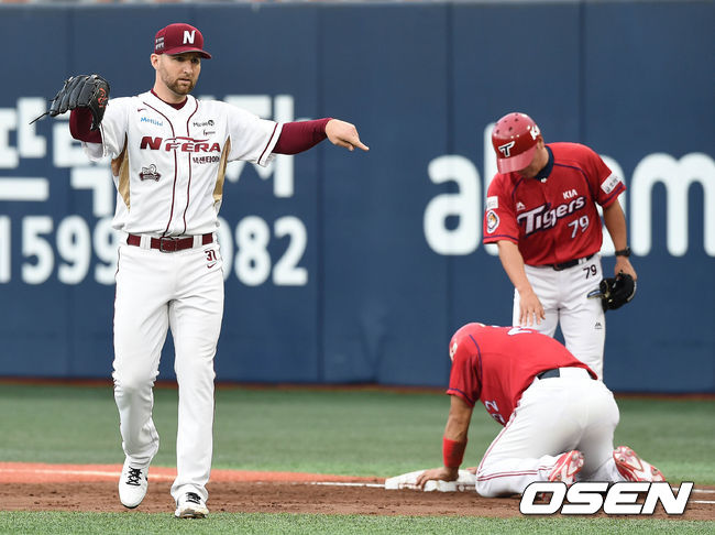 8일 오후 서울 목동구장에서 열린 '2015 타이어뱅크 KBO 리그' 넥센 히어로즈와 KIA 타이거즈의 경기 2회초 2사 1루 이홍구 타석, 런다운에 걸린 1루주자 백용환이 1루로 귀루 중 서건창에 의해 태그 당했지만 세이프 판정이 나자 피어밴드가 비디오 판정을 요청하고 있다. 비디오판독 후 아웃으로 판정.