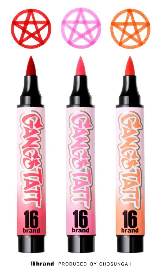 '16 갱스 탓트'는 입술에 타투를 한 것처럼 강력한 지속력을 가진 수분 가득한 마커 타입의 워터틴트로, 바르는 순간 입술에 스며들어 하루 종일 생기 가득한 입술로 만들어주는 것이 특징이다. 탄력 있는 팁을 적용하여 자연스러운 그라데이션 효과 연출이 가능하고, 덧칠할수록 진하게 발색되어 쉽고 간편하게 다양한 립 메이크업이 가능하다.