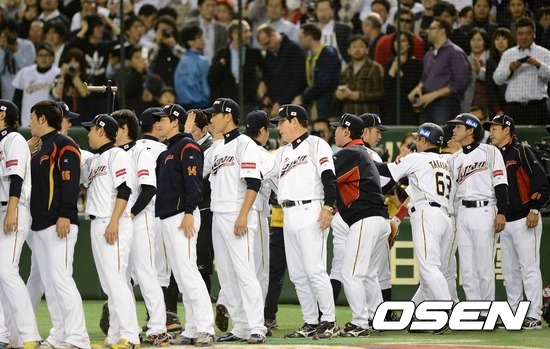 2013년 월드베이스볼클래식 당시 네덜란드를 꺾고 하이파이브를 나누는 일본 대표팀.