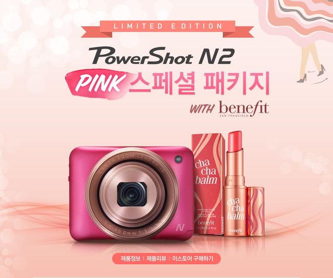 이번 스페셜 패키지는 캐논과 뷰티 브랜드 베네피트의 콜라보레이션으로 탄생했으며 캐논 파워샷 N2 핑크와 베네피트의 립밤 등 셀프 촬영을 즐기는 여성들에게 유용한 아이템이다.