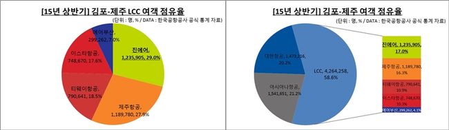 상반기 김포~제주 노선에서 5개 LCC가 올해 총 426만명 이상을 실어 날라 58.6%의 점유율을 기록한 가운데, 진에어는 총 123.6만여명을 실어 날라 2개 대형항공사 포함 7개 전체 항공사 중 17.0%의 점유율로 3위, 5개 LCC 중 29.0%의 점유율로 여객 점유율 1위를 차지했다.