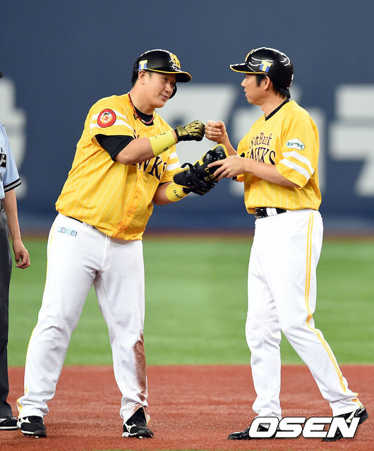 9일 오후 오사카 교세라돔 구장에서 일본프로야구 소프트뱅크 호크스와 라쿠텐 골든이글스의 경기, 3회말 2사 1,2루 소프트뱅크 이대호가 2타점 2루타를치고 코치와 기쁨을 나누고 있다.