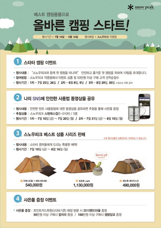 올 여름에 휴가 캠핑을 떠나는 고객들을 위하여 스노우피크 베스트 셀러 제품의 제안과 올바른 사용법을 안내하는 등 다양한 이벤트를 준비했다. 이벤트 기간은 7월 10일~8월 16일 한달 동안 진행된다.