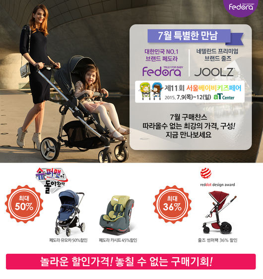 유아용품 브랜드 페도라(Fedora, www.fedora.co.kr)가 오는 9일부터 12일까지 나흘 동안 서울 양재 AT센터에서 열리는 제11회 서울 베이비 키즈 페어에 참가해 유모차 및 카시트 할인 이벤트를 진행한다.