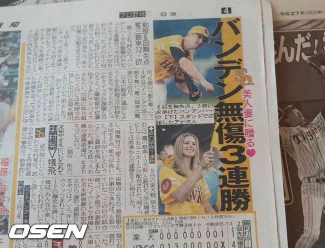 한편 그는 한국에서부터 예쁜 미모로 주목을 받았던 아내 애나 밴덴헐크로 인해 일본에서도 화제를 모으고 있다. '스포츠호치'는 10일 "소프트뱅크 밴덴헐크가 예쁜 아내의 응원에 힘입어 무패 행진을 달리고 있다"며 구장에서 응원 중인 애나와 밴덴헐크의 사진을 나란히 실어 보도했다.