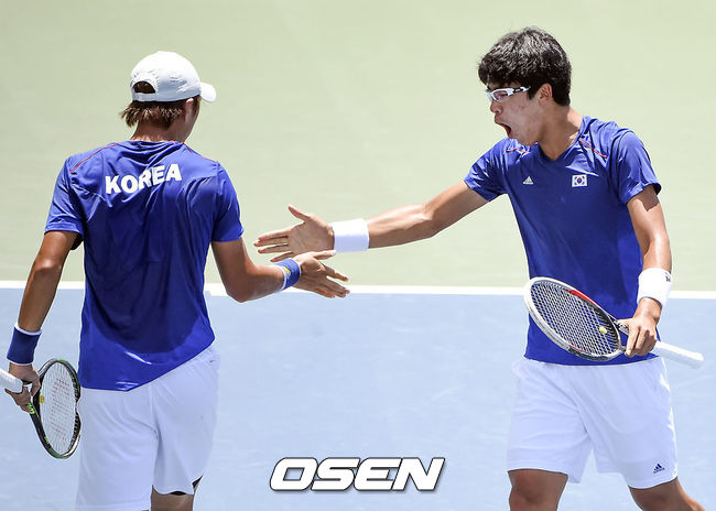 정현(19, 상지대)-남지성(22, 부산테니스협회)조는 10일 오후 광주광역시 진월국제테니스장 센터코트에서 개최된 2015 광주 유니버시아드 테니스 남자복식 준결승에서 대만의 이신한-펑신인 조를 세트스코어 2-0(6-4, 7-6, 타이브레이크 7-4)으로 제압했다. 한국은 11일 영국의 조셉 샐리스버리-대런 월시 조와 금메달을 놓고 다툰다.