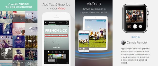 '애플워치 카메라 리모트'는 애플워치와 아이폰이 준비되었다면 애플워치가 아이폰의 아이사이트(iSight) 카메라 뷰파인더로 변신한다. 이제 셀카나 단체 사진을 완벽하게 찍을 수 있다. 아이폰 카메라에 담기는 모습을 실시간 미리보기로 확인하면서 바로 찍거나 카메라 타이머를 설정해 촬영할 수도 있다.