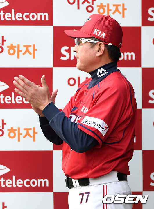 1회초 KIA 김기태 감독이 선제 득점에 박수를 보내고 있다.