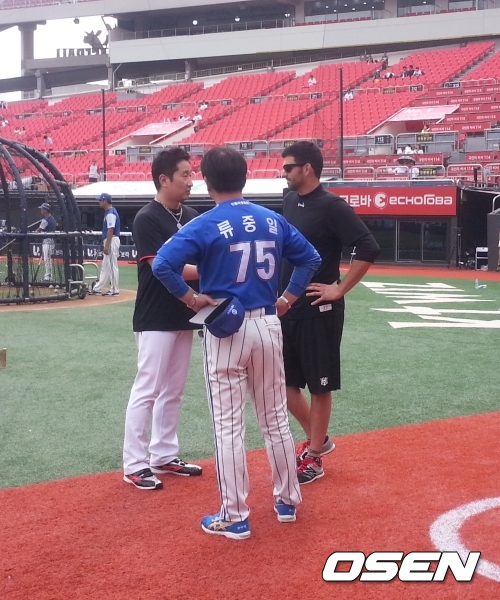 저마노는 11일 수원 케이티 위즈파크에서 열리는 ‘2015 타이어뱅크 KBO 리그’ 삼성 라이온즈와의 경기에 앞서 삼성 선수단을 찾아 반갑게 인사를 건넸다. 삼성 선수들의 훈련 시간에 그라운드에 나와 박석민 등 옛 동료들과 인사를 나눴다.