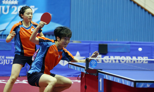 김민석-전지희 조는 11일 전남 장성군 장성홍길동체육관에서 열린 2015 광주 하계유니버시아드 탁구 혼합복식 결승에서 대만의 장훙제-전수여우 조를 4-0(11-9 11-8 11-9 11-8)로 완파했다.