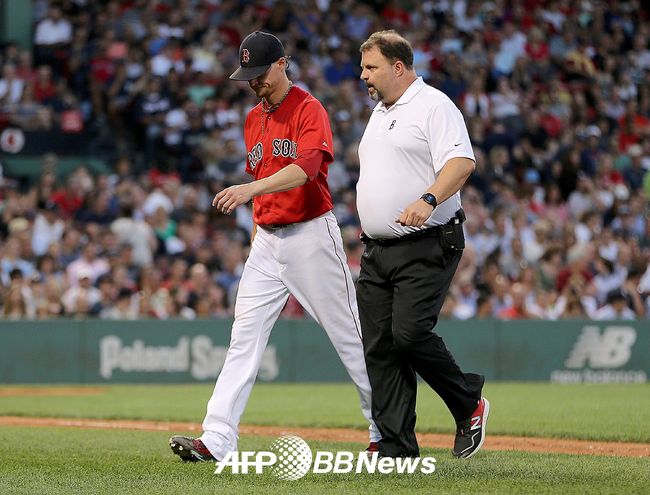 11일 뉴욕Y와 홈경기 중 팔꿈치 통증으로 교체되는 보스턴 레드삭스 클레이 벅홀츠/ⓒAFPBBNews = News1(무단전재 및 재배포 금지)