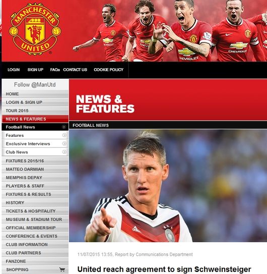 맨체스터 유나이티드는 12일(한국시간) "바이에른 뮌헨과 슈바인슈타이거의 이적을 합의했다. 메디컬 테스트와 개인 세부협상이 마무리짓고 추가적인 사항은 추후 발표할 것"고 밝혔다.