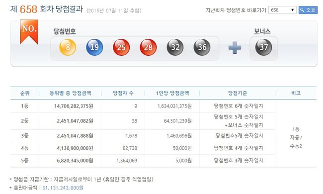 제 658차 로또 당첨번호를 보여주고 있는 나눔로또 홈페이지 캡처.