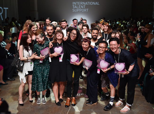 삼성전자가 11일(현지시간) 이탈리아 트리에스테에서 진행된 글로벌 패션 공모전 ITS(International Talents Support) 2015에서 '갤럭시 S6'와 '갤럭시 S6 엣지'로부터 영감 받은 예술 작품에 '삼성 갤럭시 어워드'를 수여했다. 삼성 갤럭시 어워드에서 우승한 디자이너 왕 양이 자신의 작품 앞에서 포즈를 취하고 있는 모습(위)과 삼성 갤럭시 어워드에서 수상한 디자이너들이 기념사진을 촬영하는 모습.