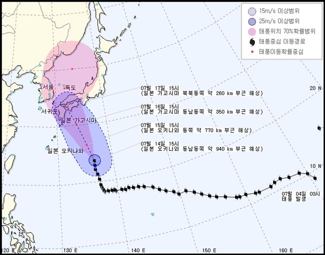 기상청에 따르면 낭카는 14일 오후 3시 현재 일본 오키나와 동남동쪽 약 940km 부근 해상을 지났다. 예상경로는 15일 오후 3시 오키나와 동쪽 약 770km 부근 해상까지 근접한 낭카는 17일 일본 가고시마 북북동쪽 약 260km 부근까지 북상할 전망이다.