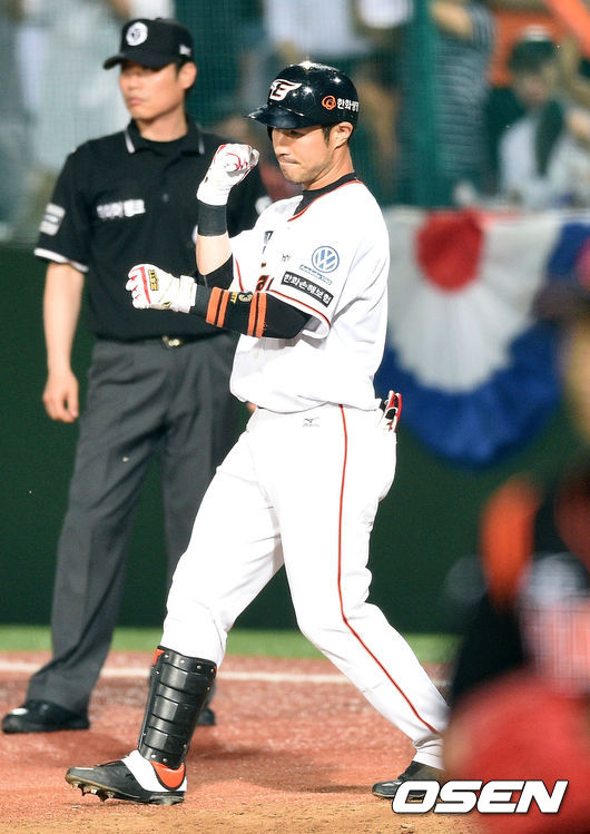 5회말 2사 1,3루에서 한화 한상훈이 중전 적시타를 치고 환호하고 있다.