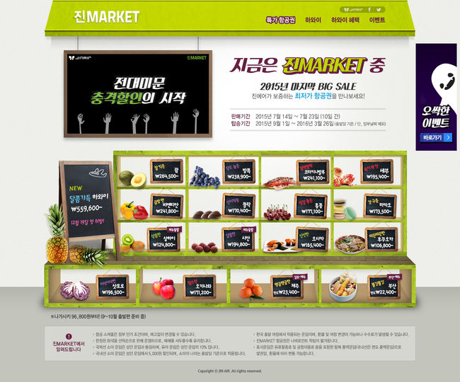 진마켓은 진에어가 국내 항공업계 최초로 백화점 정기세일 개념을 도입해 매년 상 하반기로 나누어 연중 가장 낮은 가격에 항공권을 판매하는 온라인 특가 기획전이다.
