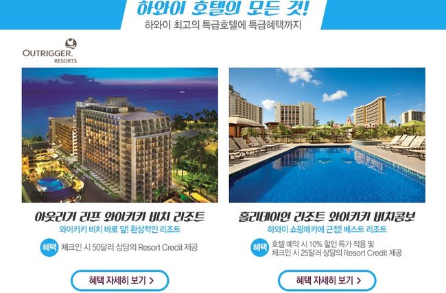 각 리조트가 제공하는 혜택은 ▲아웃리거 리프 와이키키 비치 리조트의 경우 3박 이상 예약 손님 체크인 시 50달러 상당의 리조트 크레딧을 제공한다. ▲홀리데이인 리조트 와이키키 비치콤버는 2박 이상 예약 손님 예약 시 객실 요금 10% 할인 및 체크인 시 25달러 상당의 리조트 크레딧을 제공한다. ▲아웃리거 괌 비치 리조트는 무료 픽업/샌딩 서비스를 제공(혜택 미 적용 시 1인당 편도 성인 10불, 어린이 5불)한다.