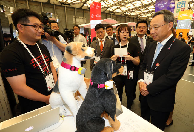 15일 중국 상하이 현지에서 KT 황창규 회장이 중국측 기업 관계자들과 함께 자사가 지원한 스타트업의 중국 진출 성과를 축하하고 있다. 왼쪽부터 해보라 김승현 이사, GT 손승서 대표, 울랄라연구소 강학주 대표, vtouch 김석중 대표, 이리언스 김성현 대표, KT 황창규 회장, 심양중국과학원 린후 소장, 심양중국과학원 젠랴오모 수석연구원, 써니옵텍코리아 진용메이 대표, 써니옵텍코리아 짜오쯔윈 상무가 스타트업의 중국 진출을 축하하며 만세를 부르고 있다. 아래는 KT 황창규 회장이 자사가 지원한 스타트업 울랄라연구소의 전시 부스를 방문해 IoT 스마트센서를 활용한 반려동물관리 솔루션에 대해 설명을 듣고 관계자들을 격려하고 있다. / KT제공