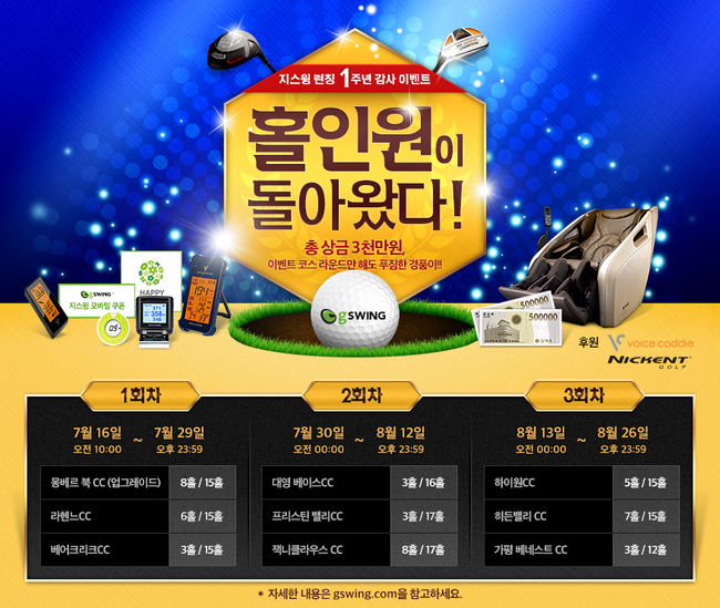 ㈜지스윙(대표이사 김석진)은 오는 16일부터 오는 8월 26일까지 지스윙 출시 1주년 감사 이벤트 "홀인원이 돌아왔다"를 실시한다고 밝혔다.