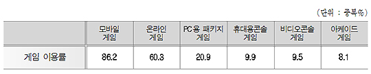 플랫폼별 이용현황을 살펴보면‘모바일게임’이 86.2%(중복응답)로 가장 높은 이용비중 보이며 게임시장의 대세임을 입증했다. 그 외 ‘온라인게임’(60.3%), ‘PC용 패키지게임’(20.9%), ‘휴대용콘솔게임’(9.9%), ‘비디오콘솔게임’(9.5%), ‘아케이드게임’(8.1%)의 순으로 이용비중을 보였다.